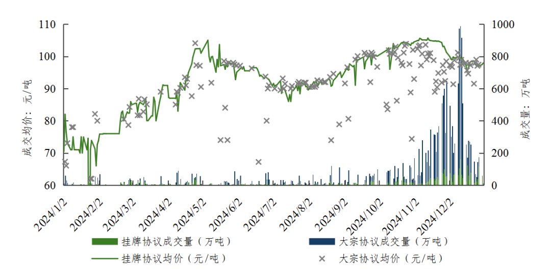 履約驅(qū)動型交易特征仍然明顯。年內(nèi)交易量主要集中在10—12月,占全年交易量的76.53%。10月發(fā)電企業(yè)開始集中履約采購,成交量開始升高,11月開始成交量激增,12月達(dá)到最高峰,掛牌協(xié)議日成交量最高達(dá)到163.0萬噸,是碳市場開市以來最高日成交量。2024年集中交易時(shí)間相較第二履約期有所滯后,市場仍表現(xiàn)出明顯的履約驅(qū)動現(xiàn)象。