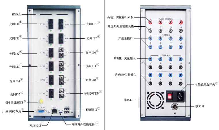 光數(shù)字繼電保護測試儀工控型側(cè)面板指示說明圖